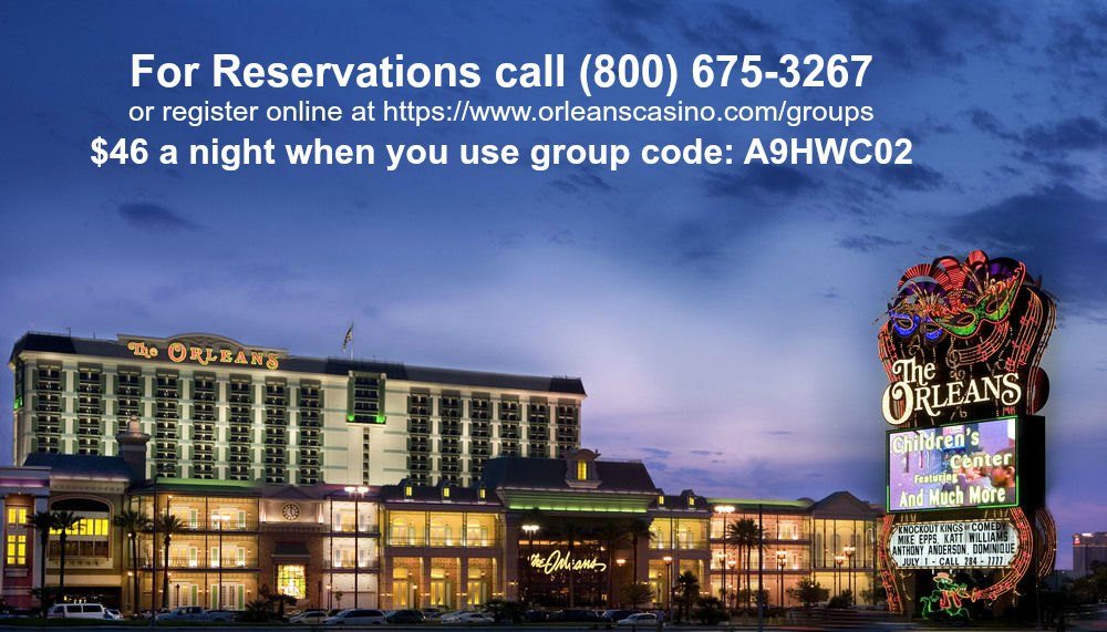 The Orleans Hotel and Casino is a landmark hotel in Las Vegas. It is conveniently located near the south end of Las Vegas Blvd. but just off the strip at 4500 W Tropicana Ave. We have secured discounted hotel rooms at $46 per night plus resort fees. For Reservations call (800) 675-3267 or Register online at https://www.orleanscasino.com/groups and use group code: A9HWC02. The Group name is: HPTI Winter Conference. All lodging expenses are the responsibility of attendee and are not included in conference registration/tuition fees.